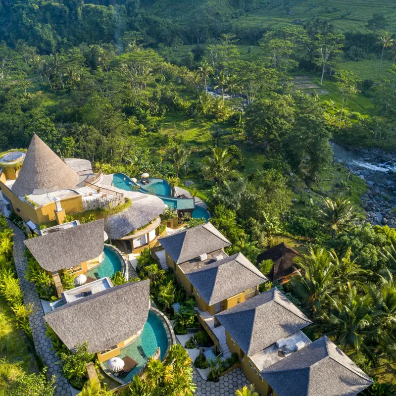 Wapa di Ume Sidemen is a five star boutique resort that has a 360° panoramic hillside with a magical backdrop of the tallest mountain of Mount Agung, and surrounded by rice fields as its centre piece.