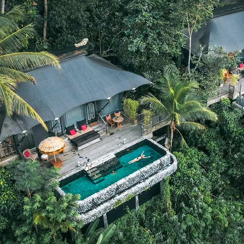 Capella Ubud, Bali offers twenty-two ultra-luxurious one-bedroom tented retreats as well as one two-bedroom lodge, all featuring private salt water pools.