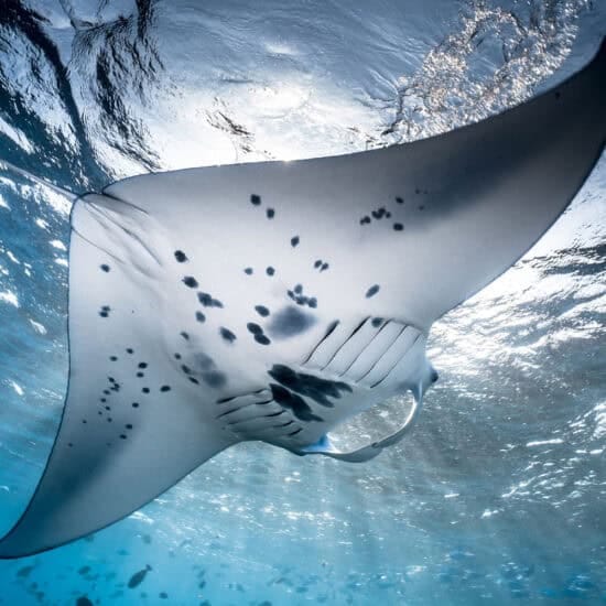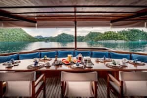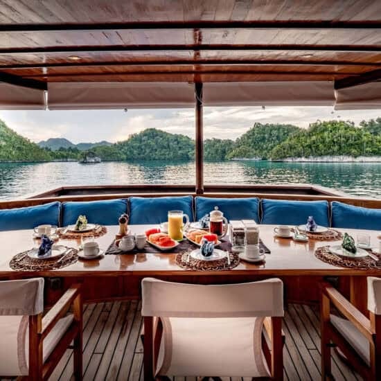 Witness the bird of paradise dance at Tapokreng, marvel at Mioskon Island’s bat colonies, and dive with manta rays at Blue Magic. Enjoy a traditional Indonesian Rijsttafel dinner onboard.
