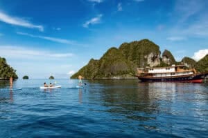 Fly from Jakarta to Sorong and embark on a stunning Raja Ampat cruise. Explore Friwinbonda Island's vibrant coral reefs and swim with majestic sea life. Relax on the beach, swing into the sea, and savor evening cocktails on deck.